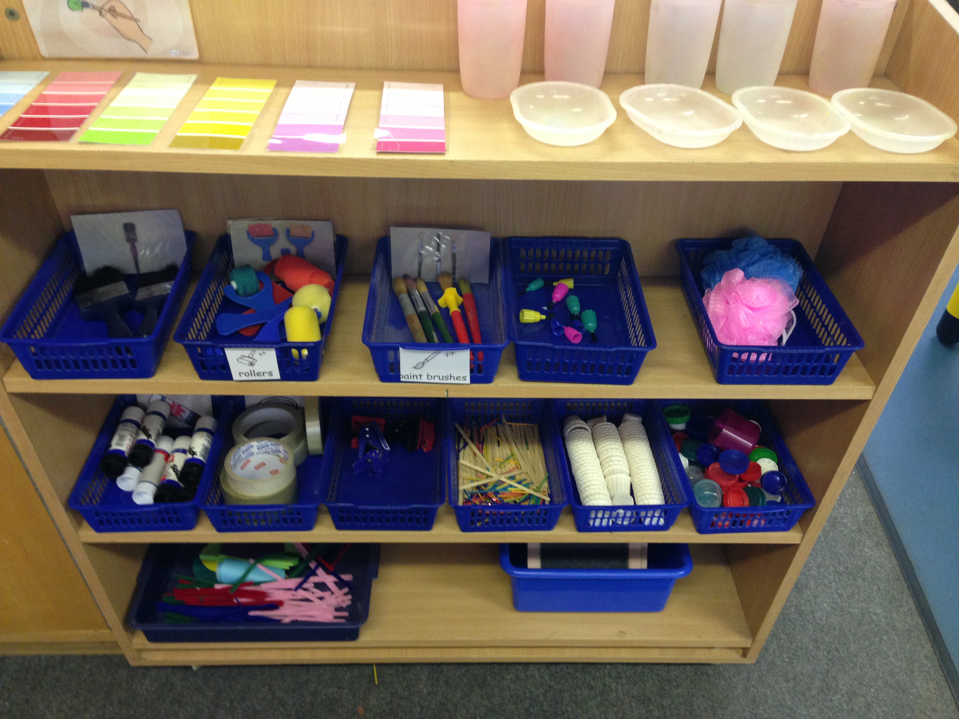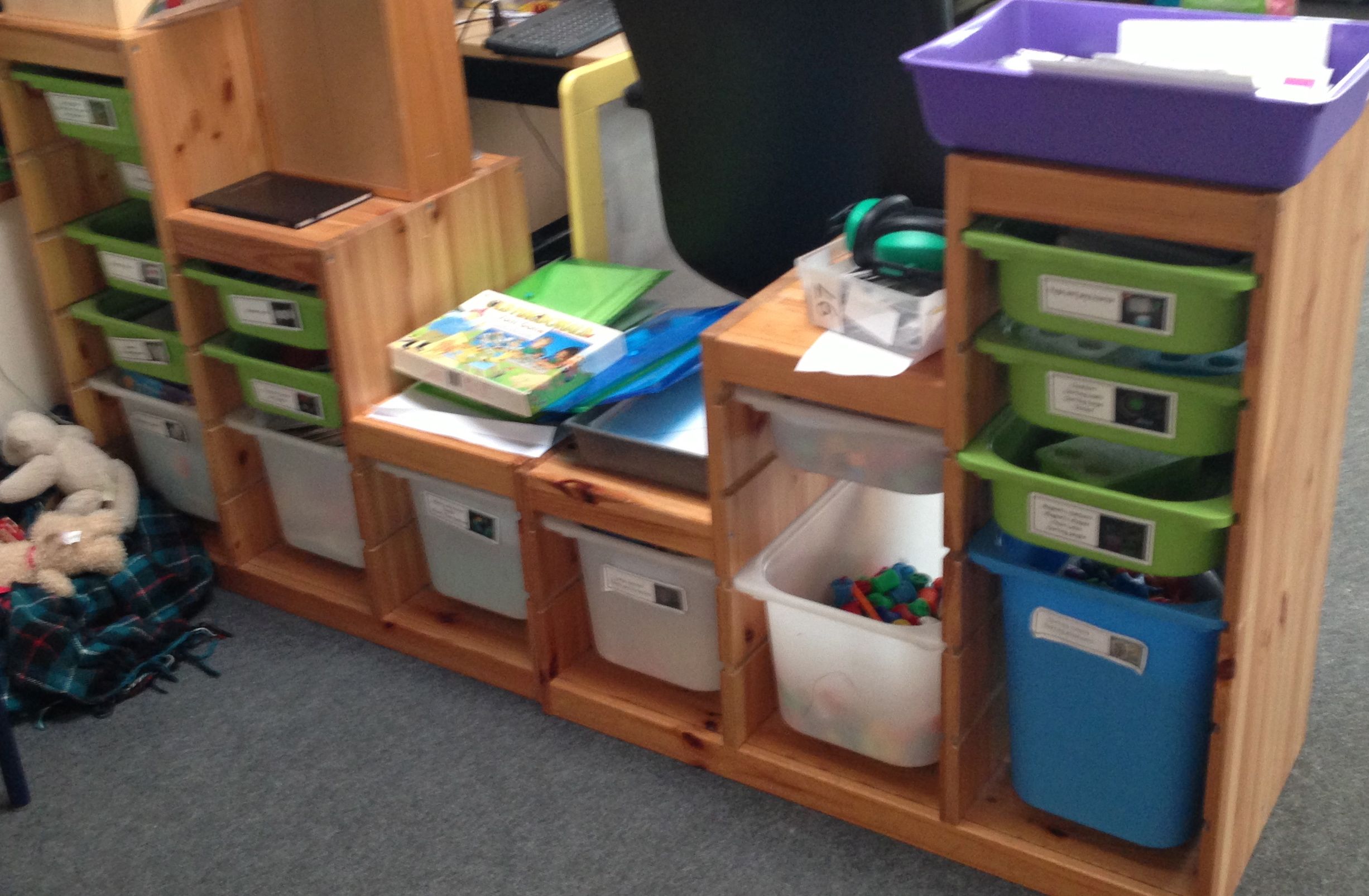 The creative area now has a shelving unit with trays containing the resources from the deep boxes.