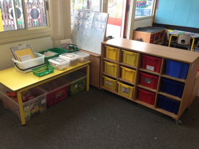 For me, it makes the resources stand out, as colour coordinated containers are less distracting. The focus of the area seems to make more sense to me, when the containers are the same colour? What do you think?… Not everything is labelled yet, but I’m slowly getting there!