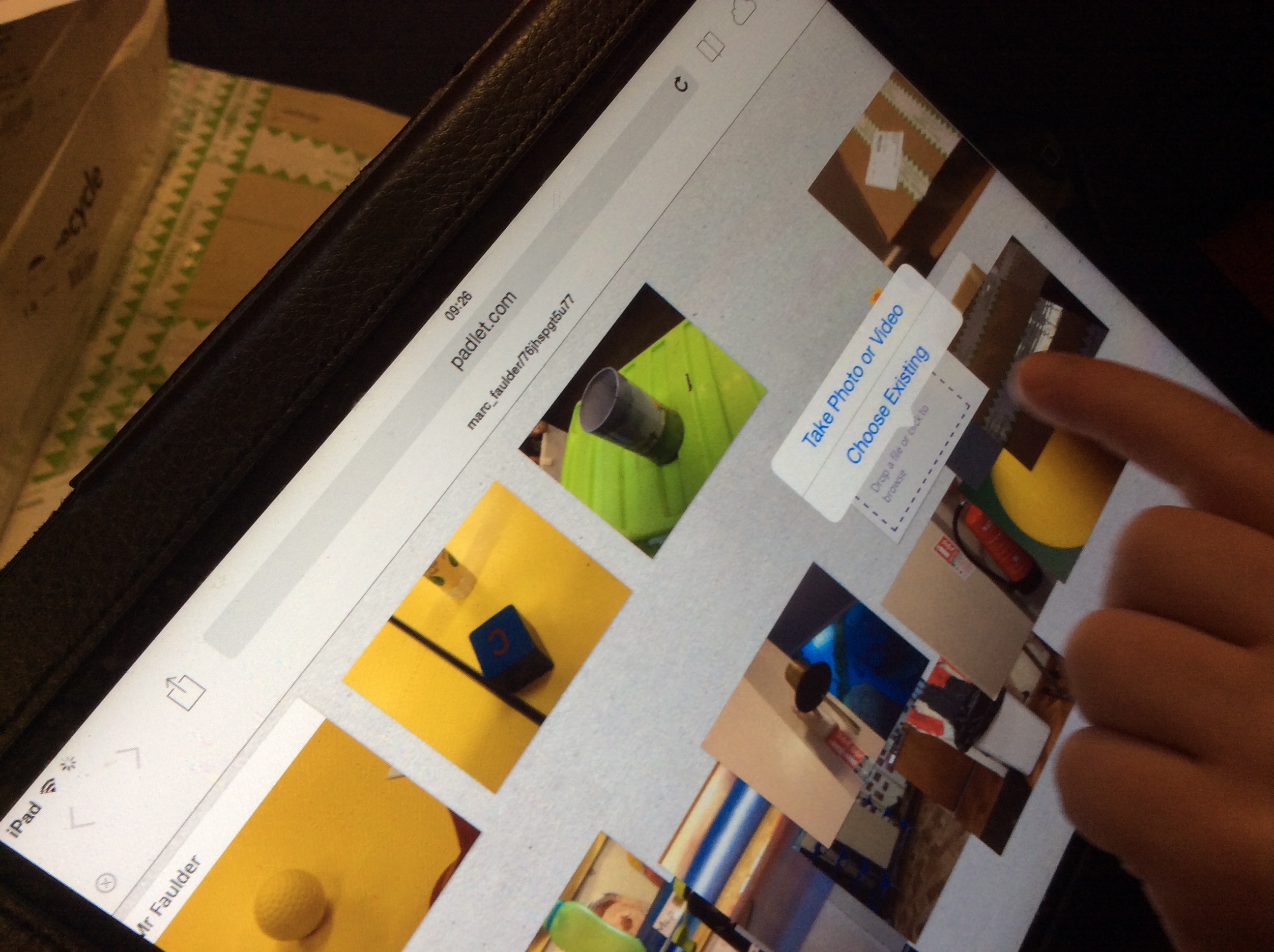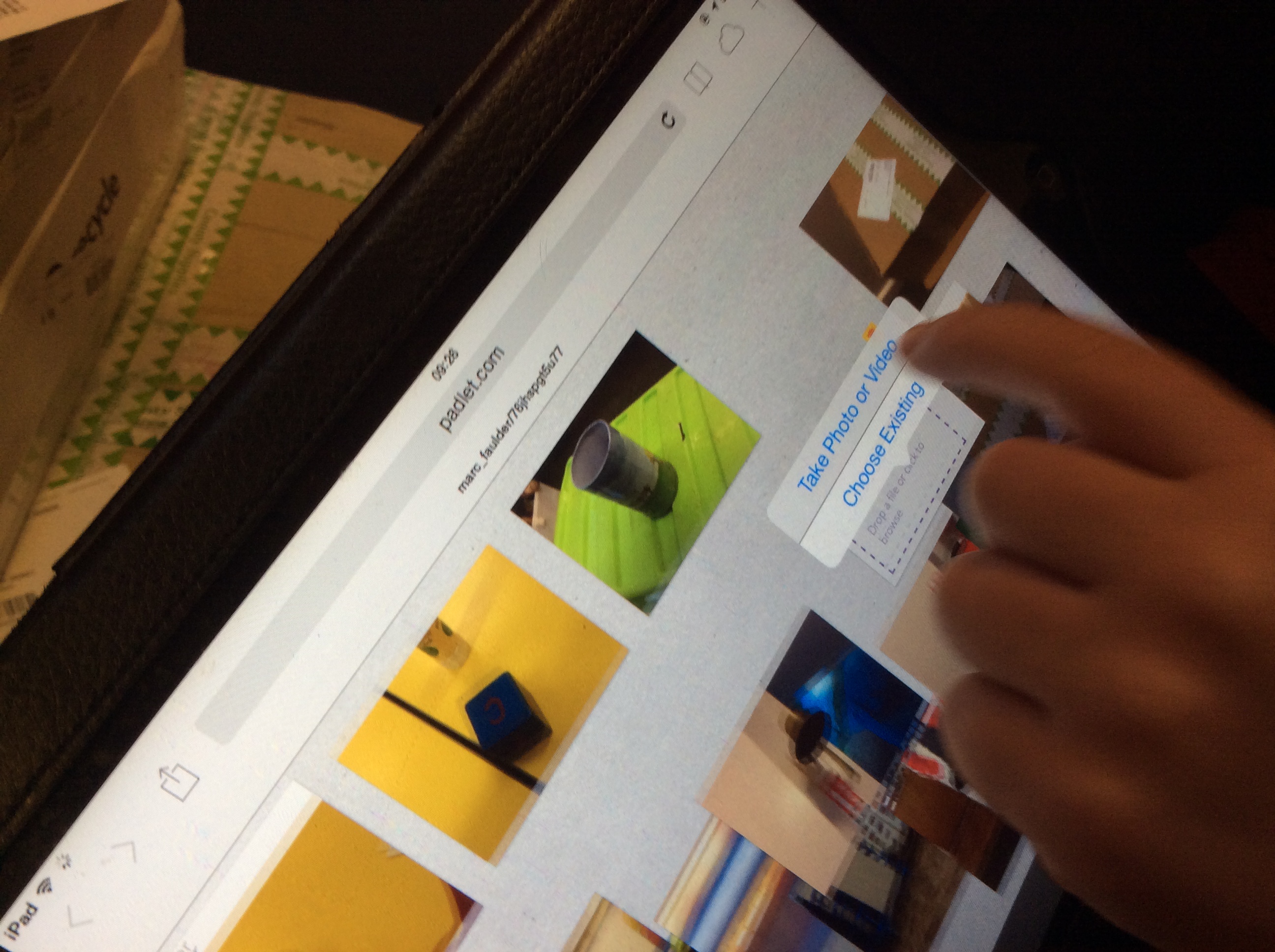 To use Padlet, you double tap a place on the board you want to post to. This gives you the option to type a note. Pressing the import icon opens a second tile. Tapping on this launches the camera app and a photograph can be taken and inserted to the board. Across all devices using the same Padlet URL, every post will be synced and displayed in real time. Therefore, all users will see the same images as they are inserted.