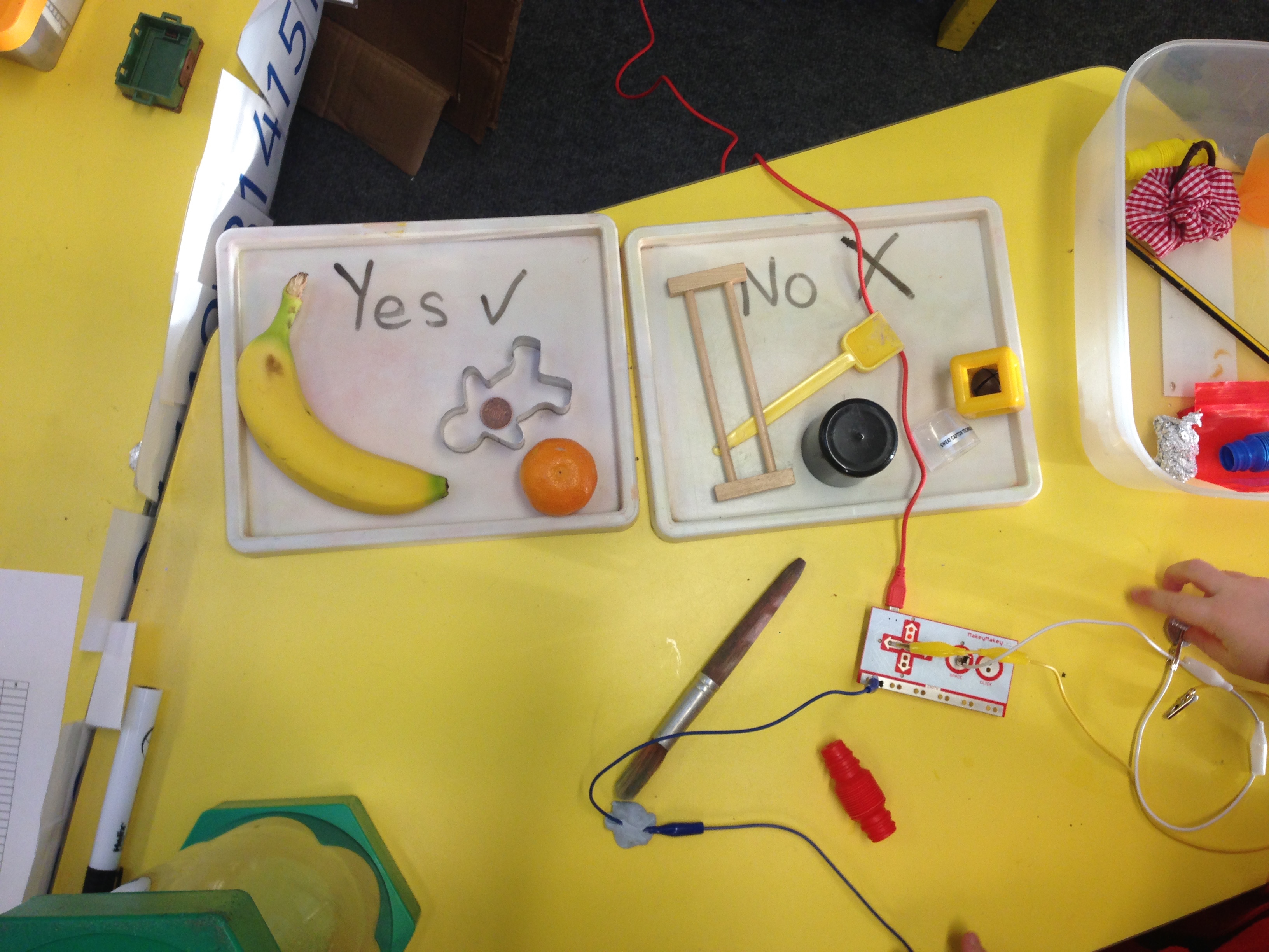 It became quite complex, with a few children noticing that some objects are made up of plastic and metal and it depends on where the clip is attached. They sorted these samples in to a ‘middle’ group between the ‘Yes’ and ‘No’ trays.