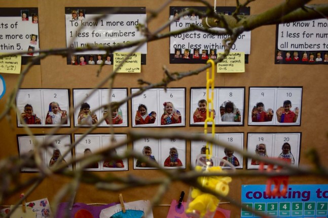 An example of personalised display is pictured here, with children’s photographs displayed with the letter which represents that sound. We also capitalised on World Book Day costumes and added their character photographs to the initial sounds on the display. This personalised phonics display is of course at child eye level, with the adult’s eye level seeing targets and progress notes in Literacy.