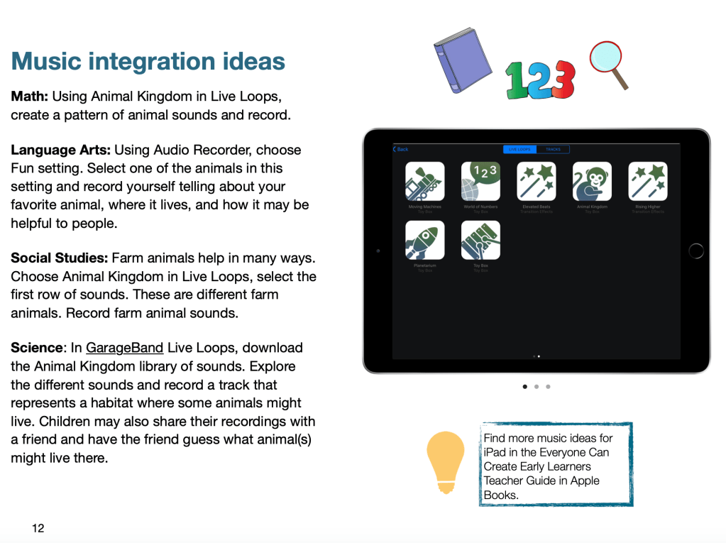 Listen to sounds from the ocean and use GarageBand to compose soundscapes of sea life. An example of this and instructions to record soundscapes are included in the book.