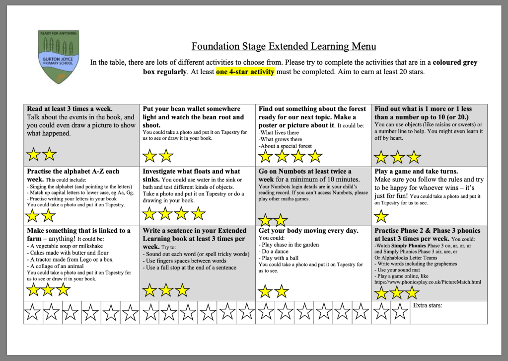 Every 2 weeks we will be sending home 9 activities worth different amounts of stars. Children will aim to collect 20 stars all together. This is in line with our homework policy so it is familiar to families.