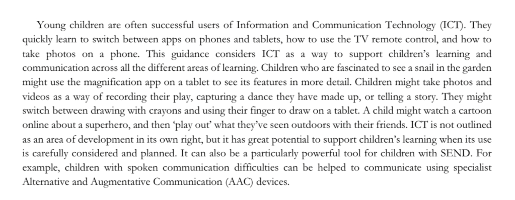 You will be aware that the assessment of Technology will not be included in the revised Early Learning Goals and Development Matters framework. This is the same for Shape and Space. Julian Grenier points out in his book “Working With The Revised Early Years Foundation Stage Principles into Practice” that Development Matters is an assessment framework. It is not a curriculum. By only teaching towards Development Matters, children miss out on the bigger picture of learning. Grenier goes on to explain that this shorter revised version provides more freedom for professionals to do what is right for the children they are working with. He also writes about technology’s role in learning: