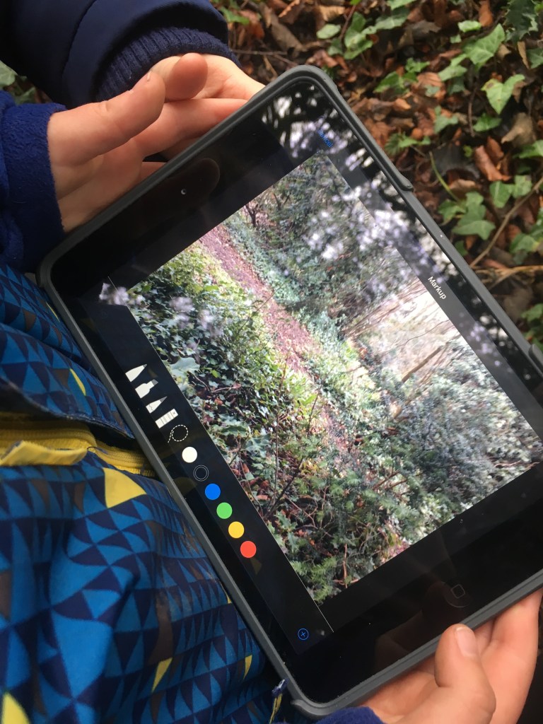 Take your iPads to the outdoor classroom and photograph real story settings from a book that you are reading in class. Use the built in Markup tools to draw characters onto the photographs, right there in the moment! Take those story pictures back to the classroom and use them for story writing.