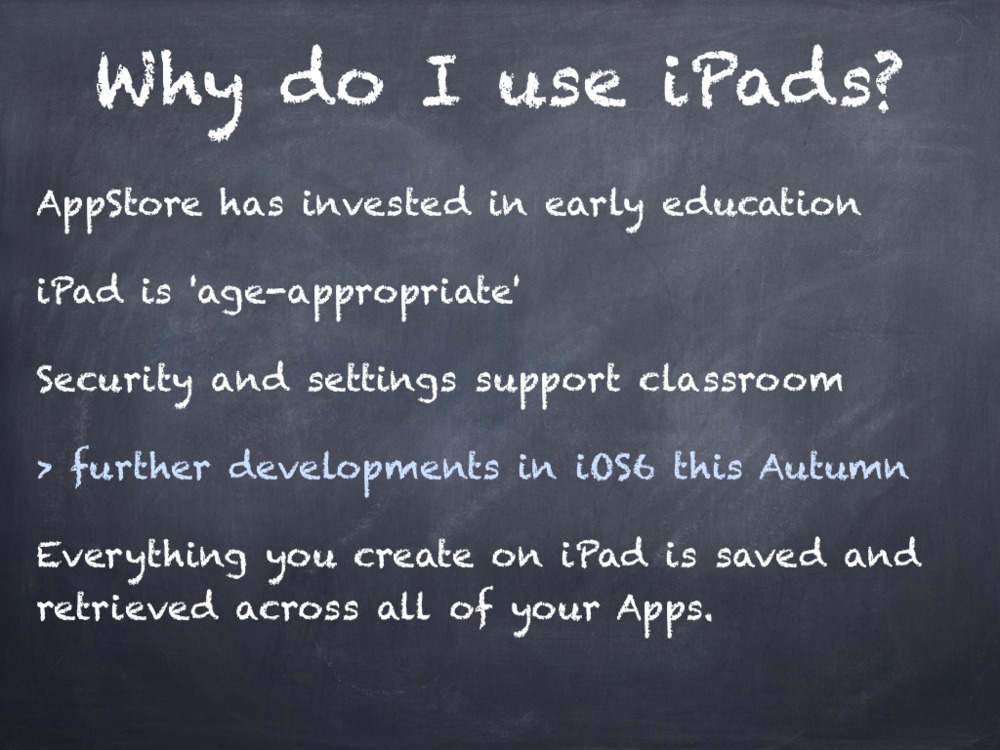 The security settings also allow children to access the apps which are appropriate to them, and apps like a web browser, AppStore, iTunes can be disabled for classroom use. The latest version of iOS brings Guided Access in the Accessibility settings. This means that in an early years setting, the teacher can set Guided Access so that one particular app is used in that session, and at other times can have free choice of what apps to use.